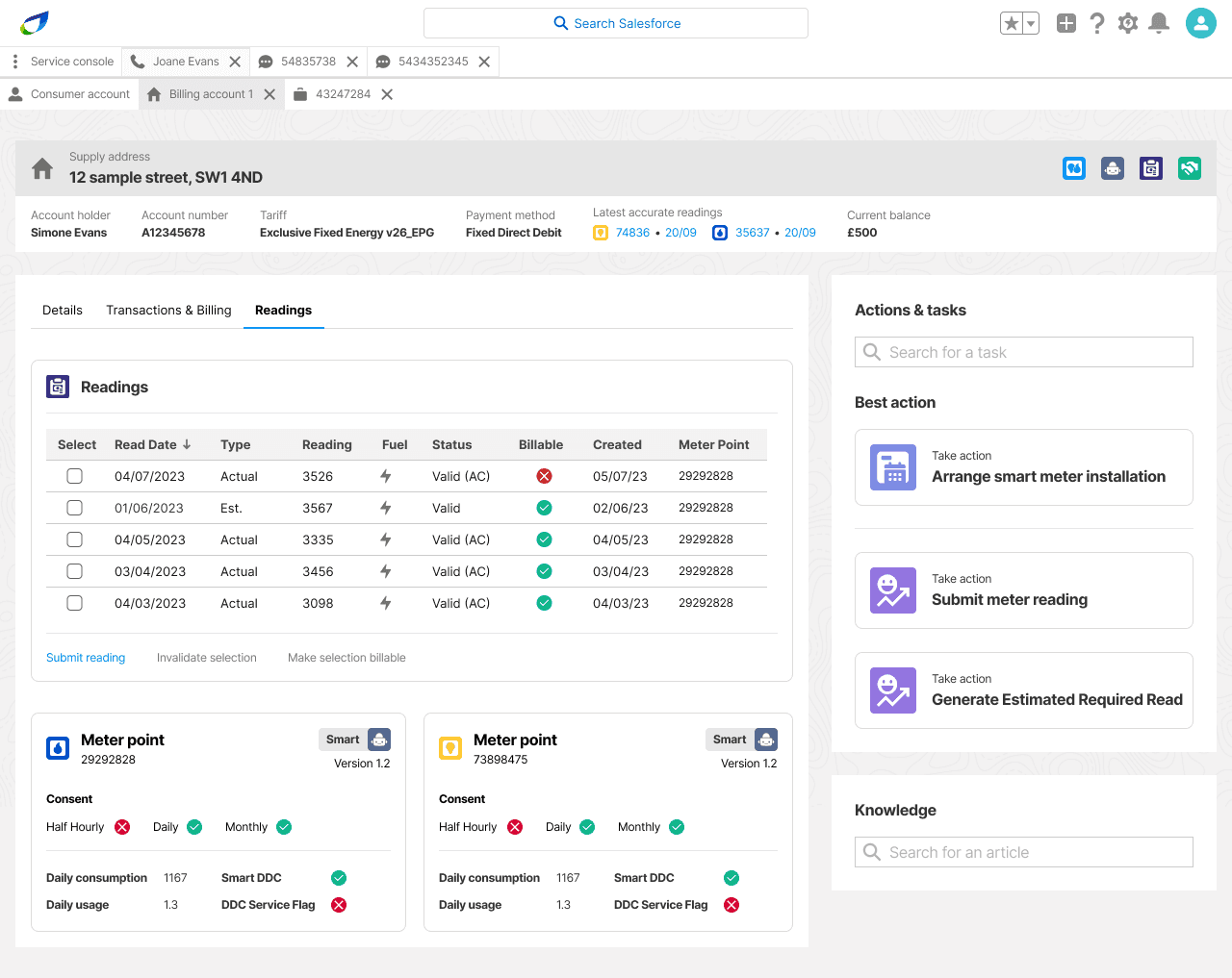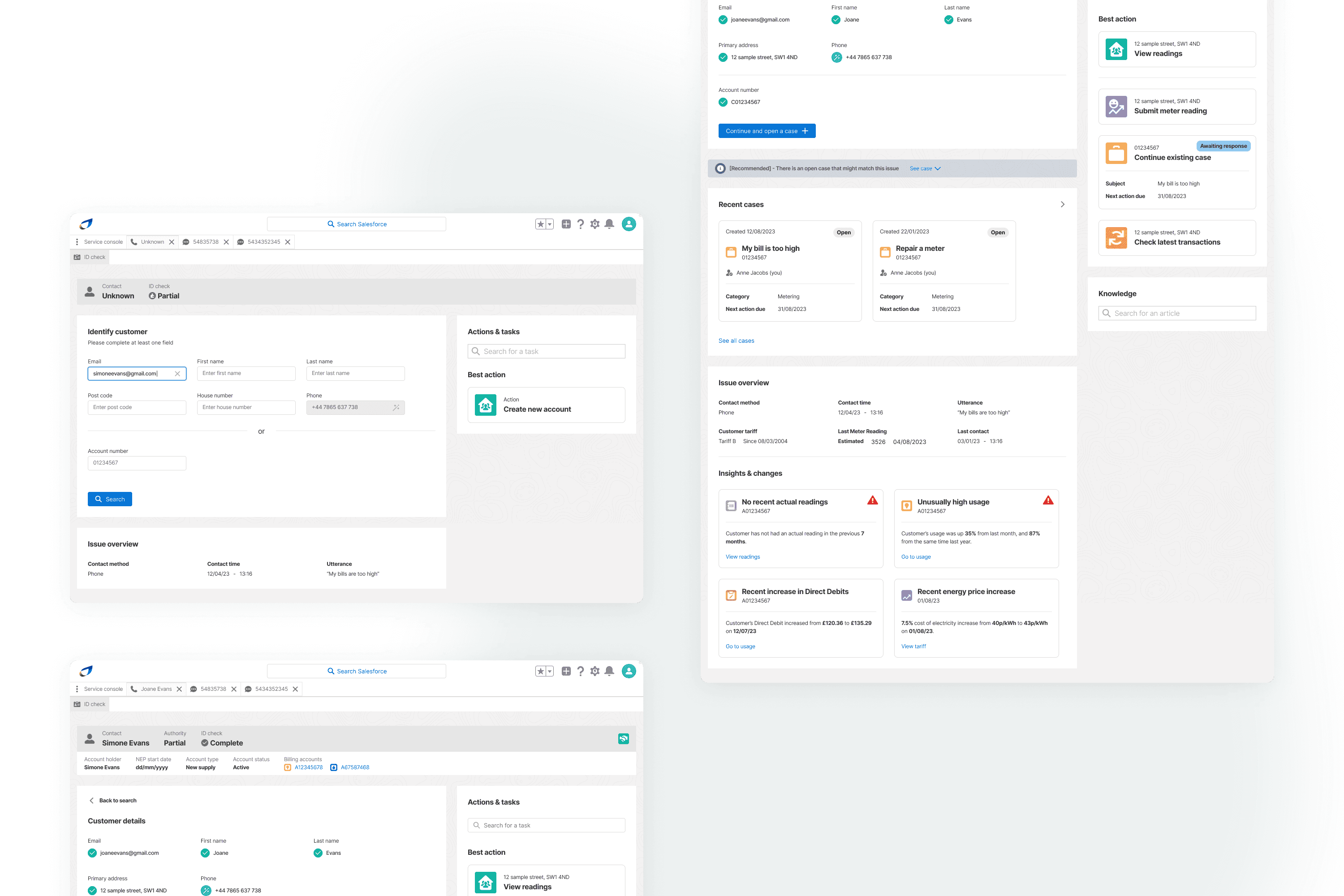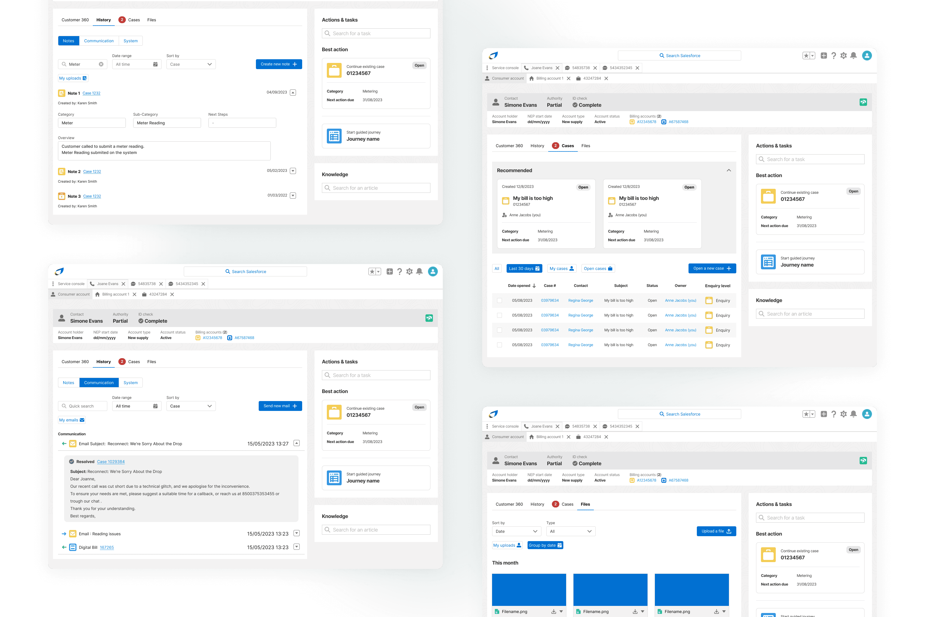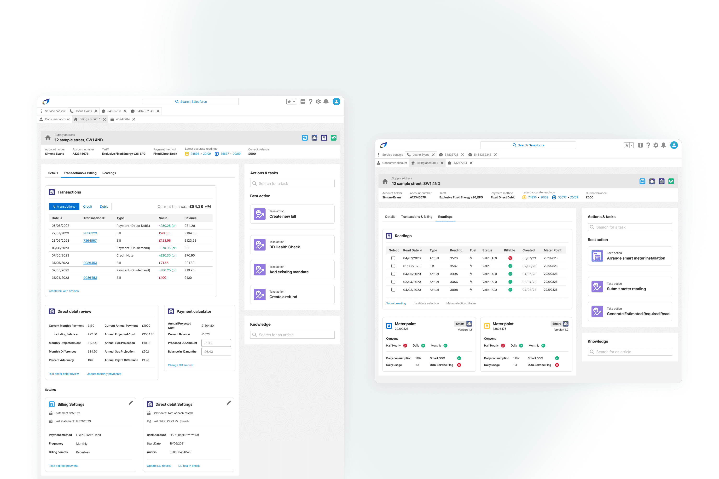 The task was to integrate British Gas's billing and metering tool - ENSEK Ignition, into Salesforce, using APIs to pull in key data and displaying each data point in the best possible way, in the right place, at the right time. Based on our research we developed these 3 screens.