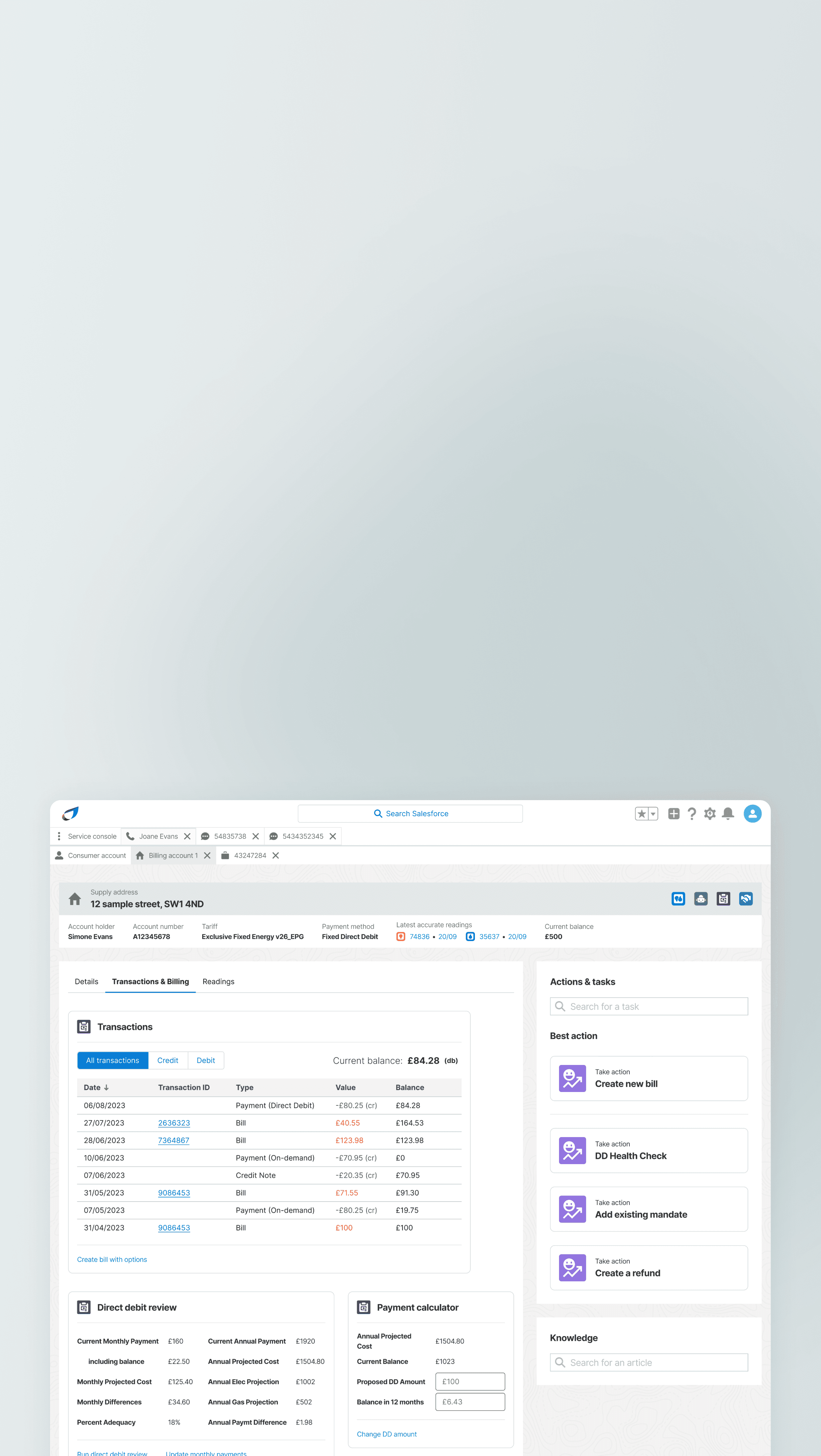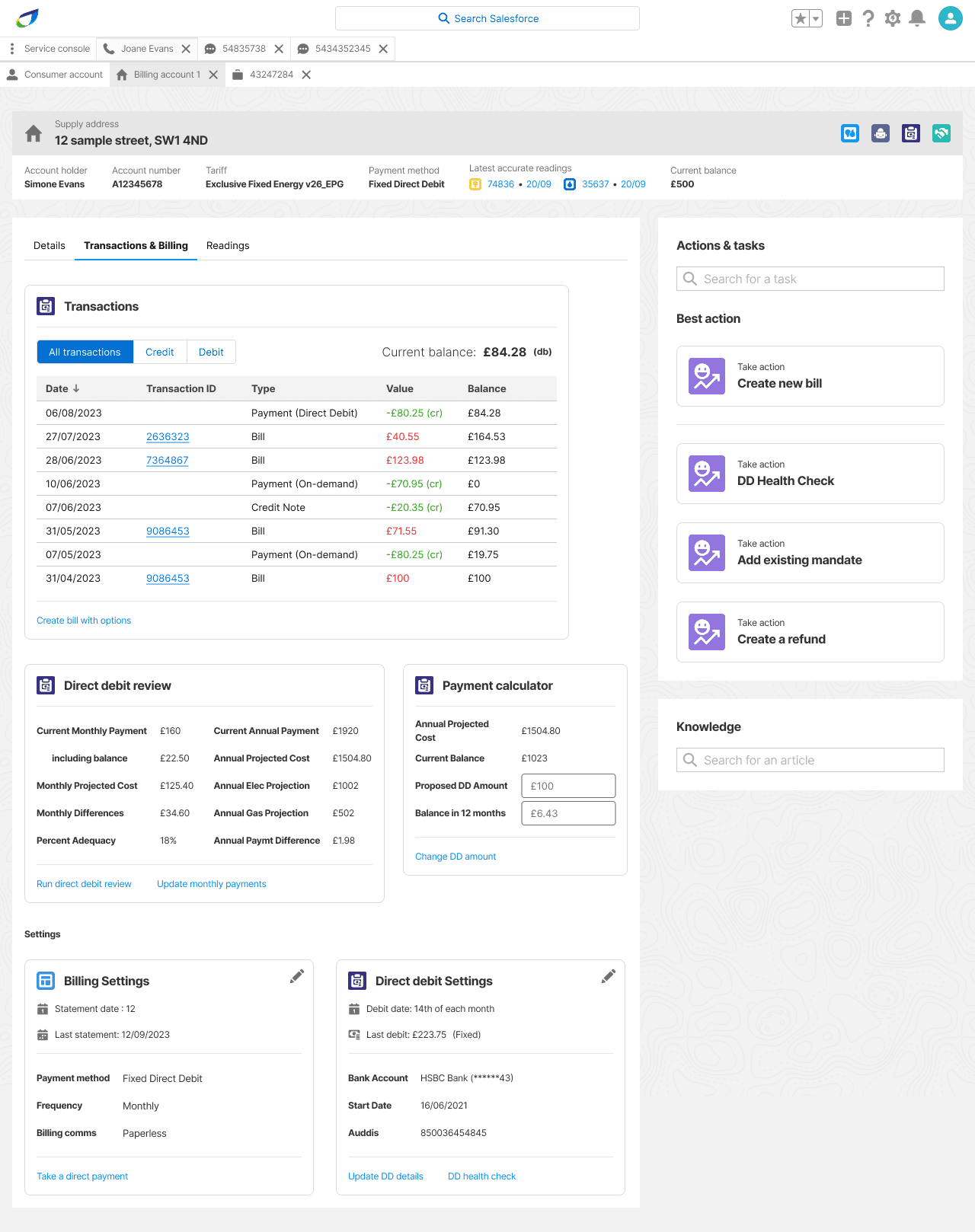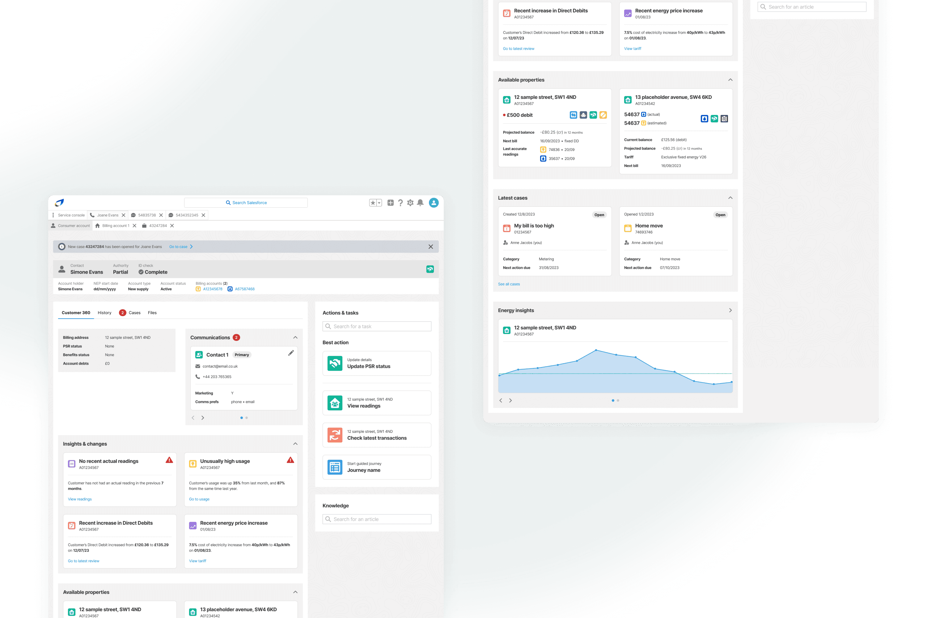 The task was to integrate British Gas's billing and metering tool - ENSEK Ignition, into Salesforce, using APIs to pull in key data and displaying each data point in the best possible way, in the right place, at the right time. Based on our research we developed these 3 screens.