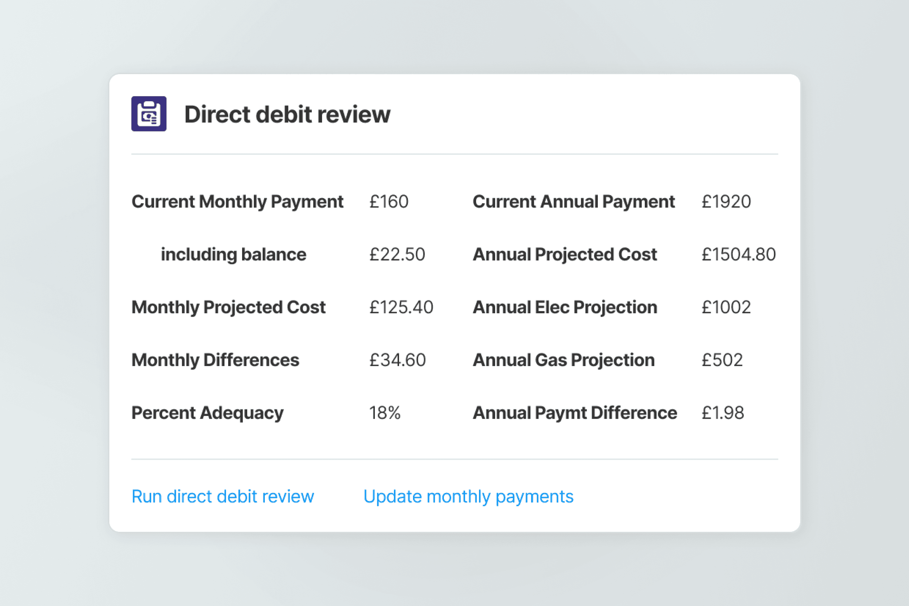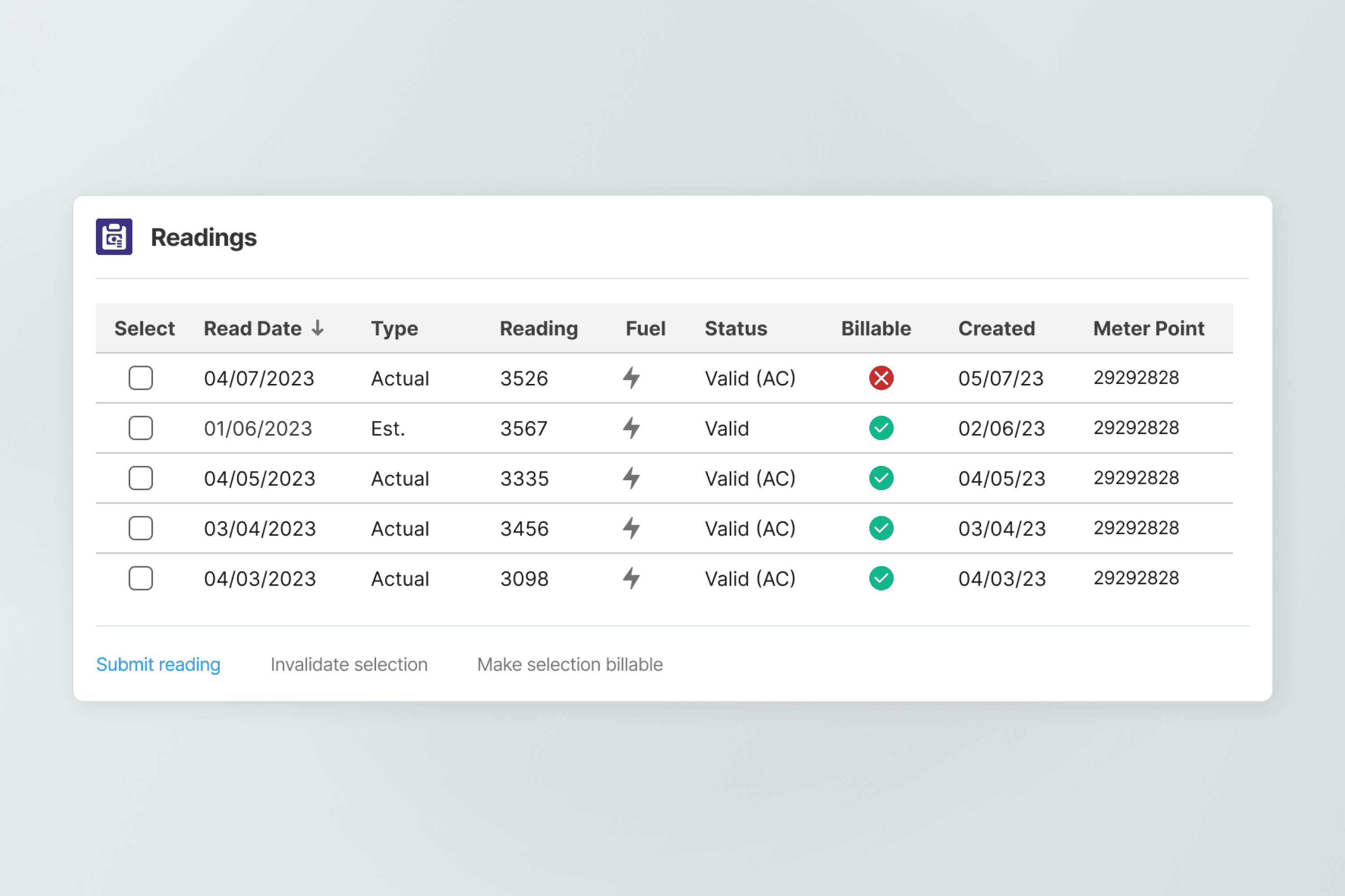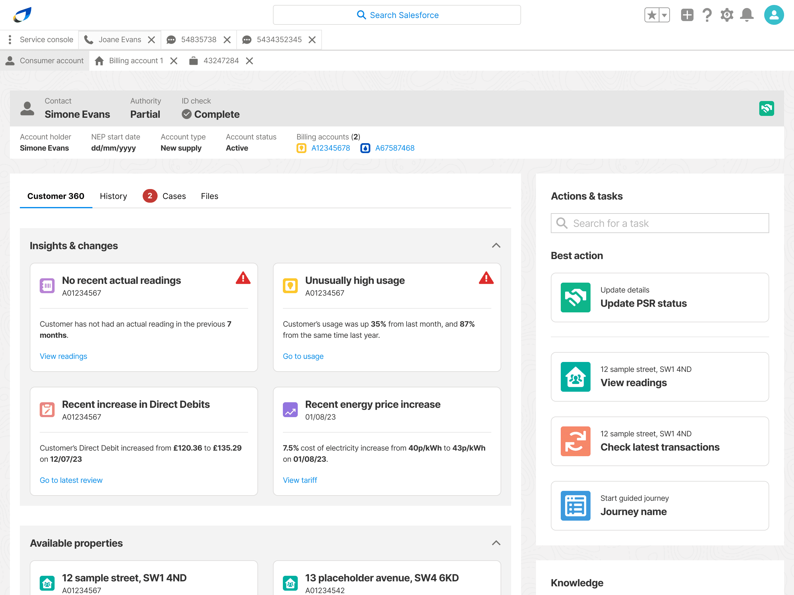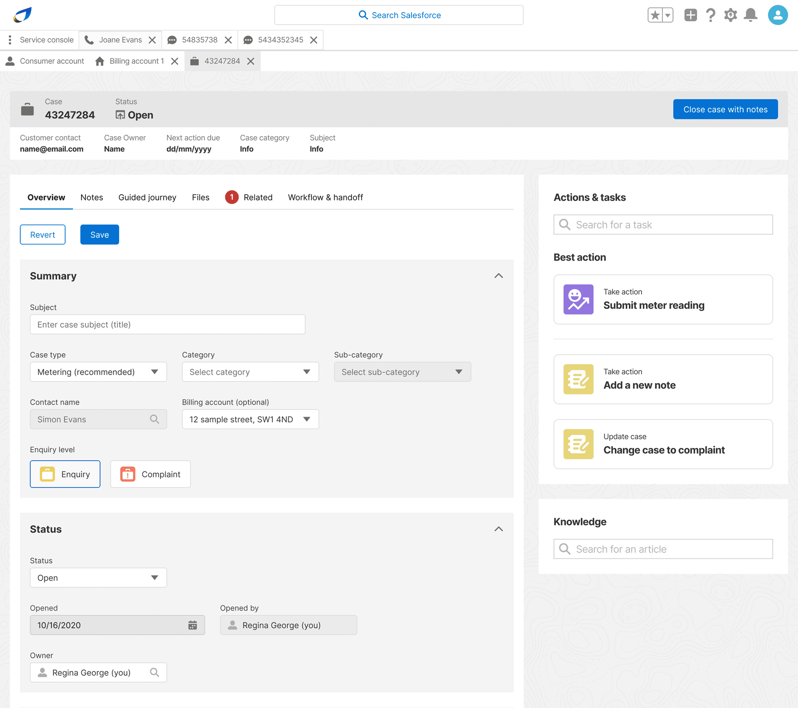 The task was to integrate British Gas's billing and metering tool - ENSEK Ignition, into Salesforce, using APIs to pull in key data and displaying each data point in the best possible way, in the right place, at the right time. Based on our research we developed these 3 screens.