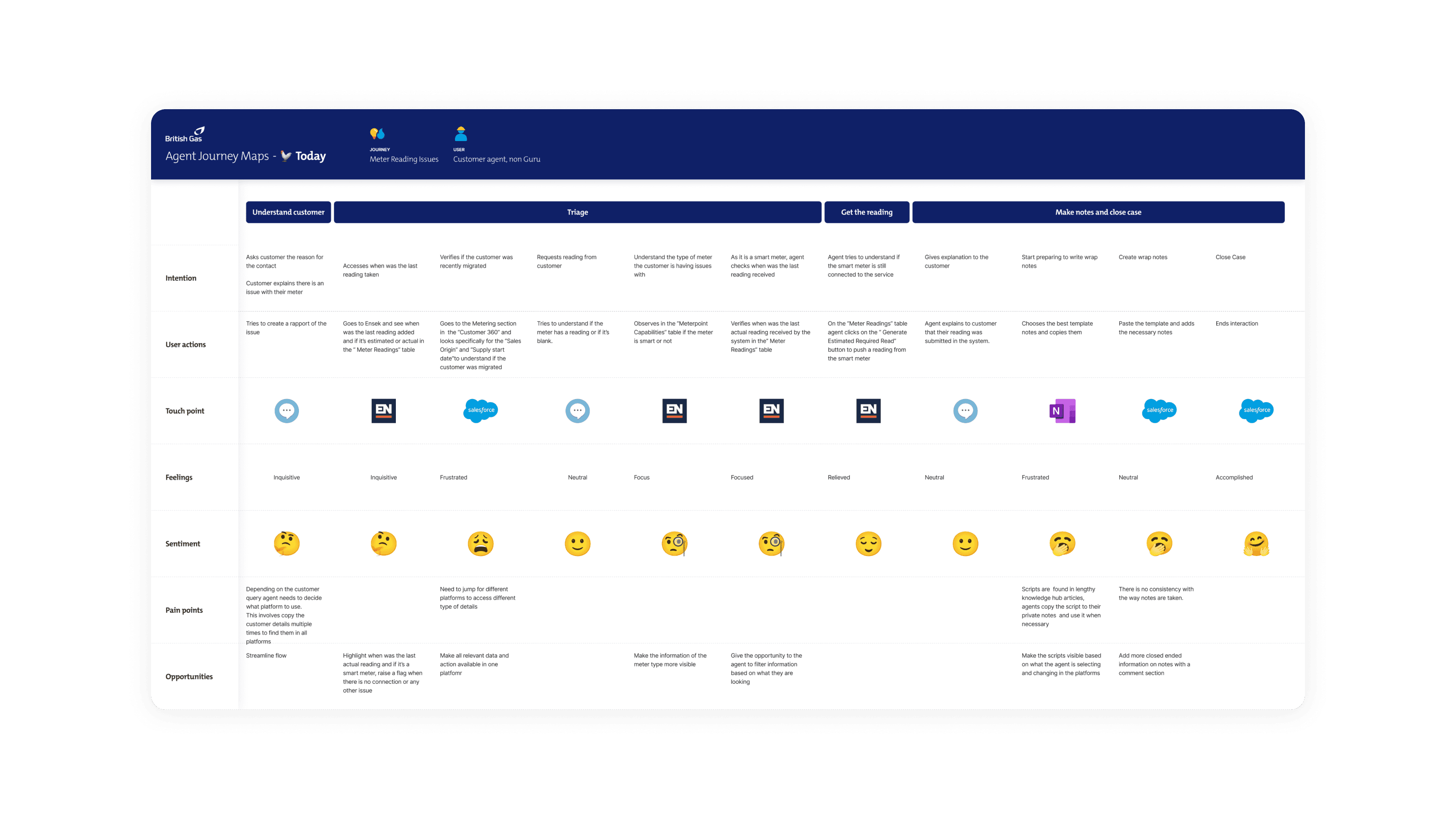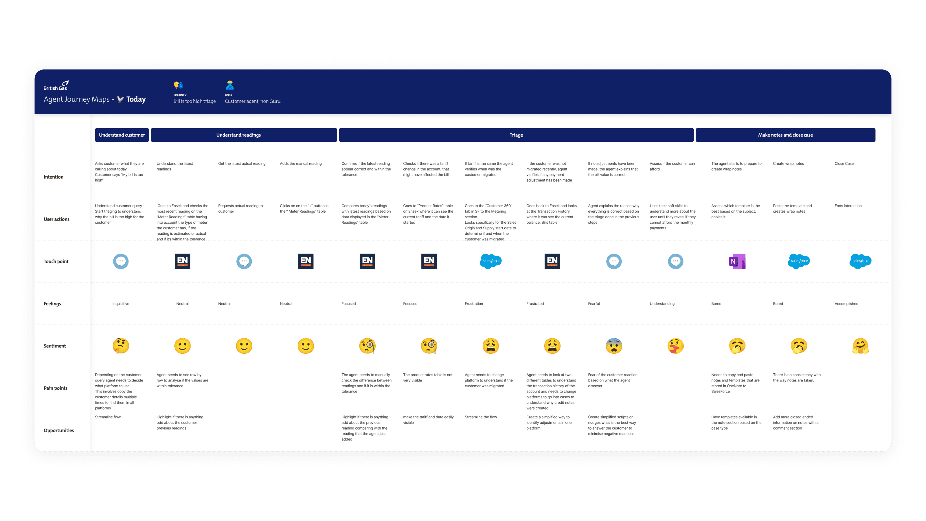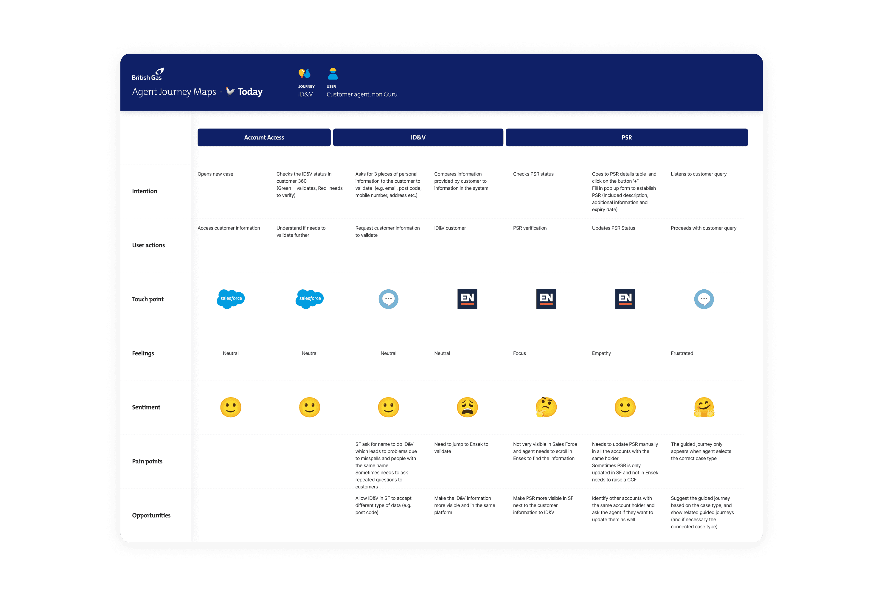 We first mapped out the journeys for the key focus areas through a combination of user interviews, SME interviews and exploration of the Salesforce and ENSEK stools used by agents.