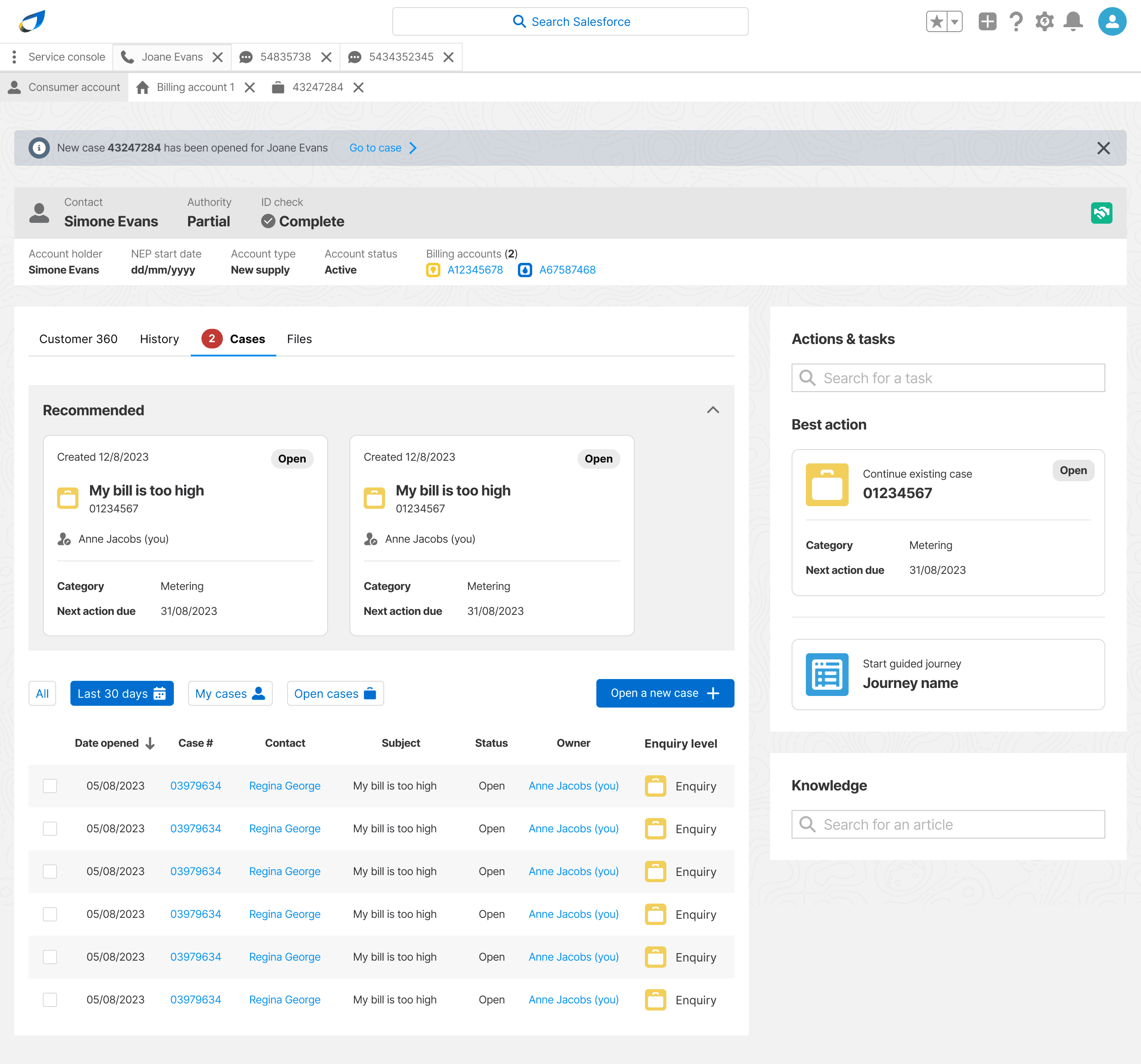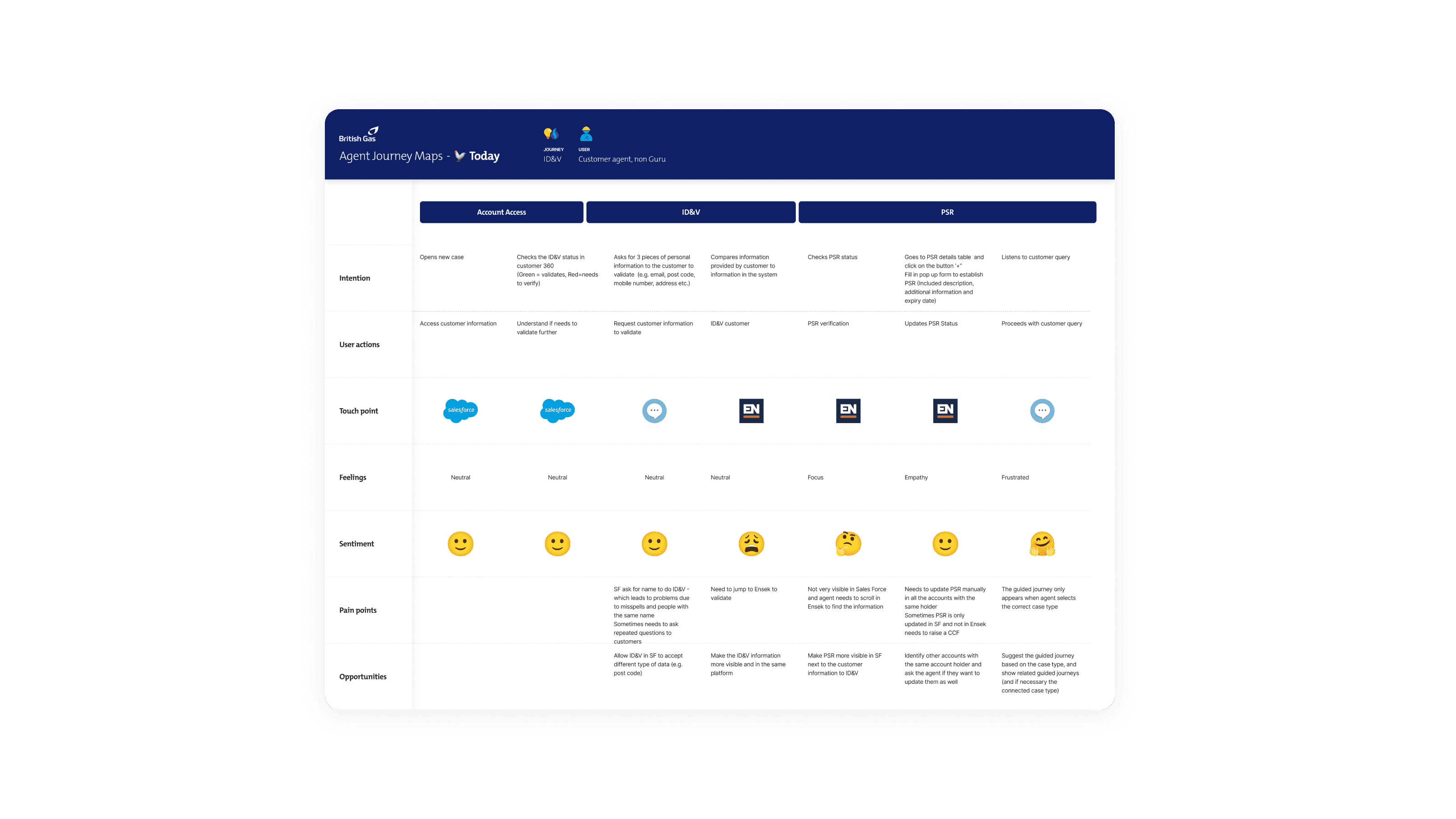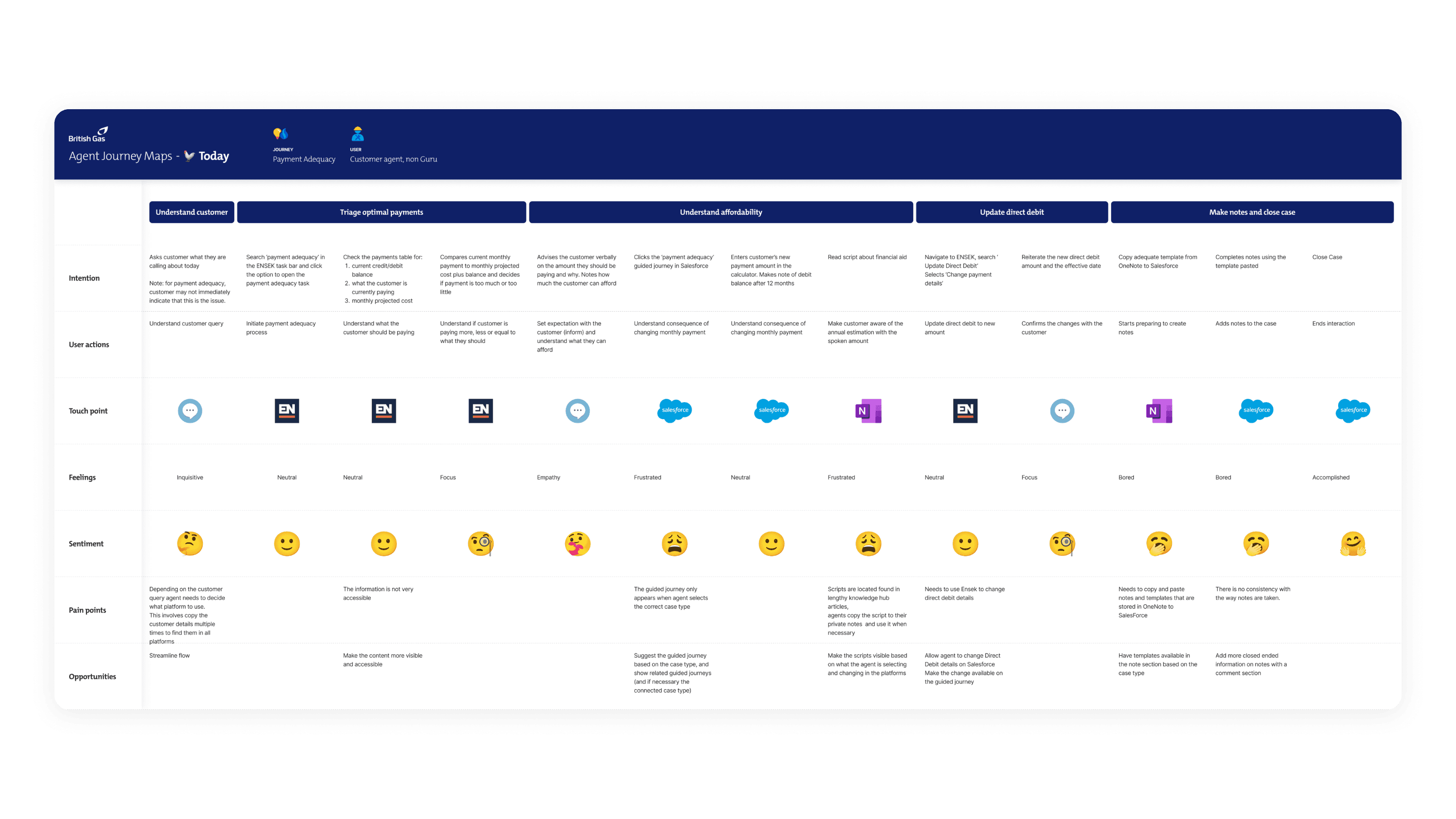 We first mapped out the journeys for the key focus areas through a combination of user interviews, SME interviews and exploration of the Salesforce and ENSEK stools used by agents.