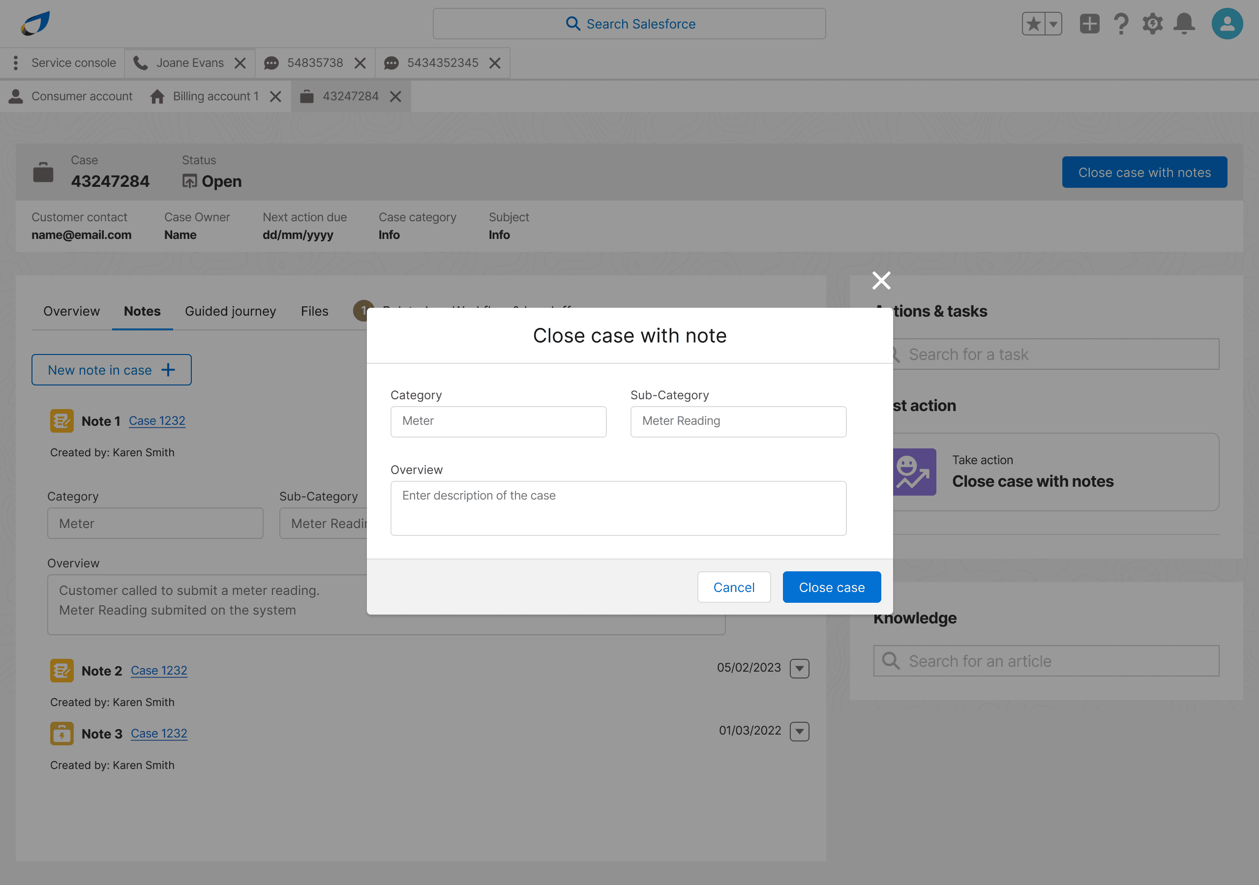 On closing a case OR exiting a case tab, Salesforce would trigger a smart modal to prompt the agent to create at least basic notes. This would be pre-populated if possible.