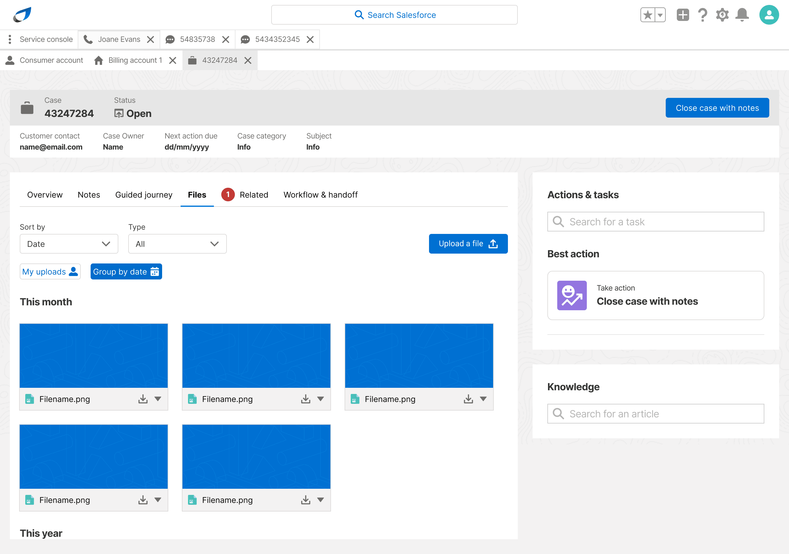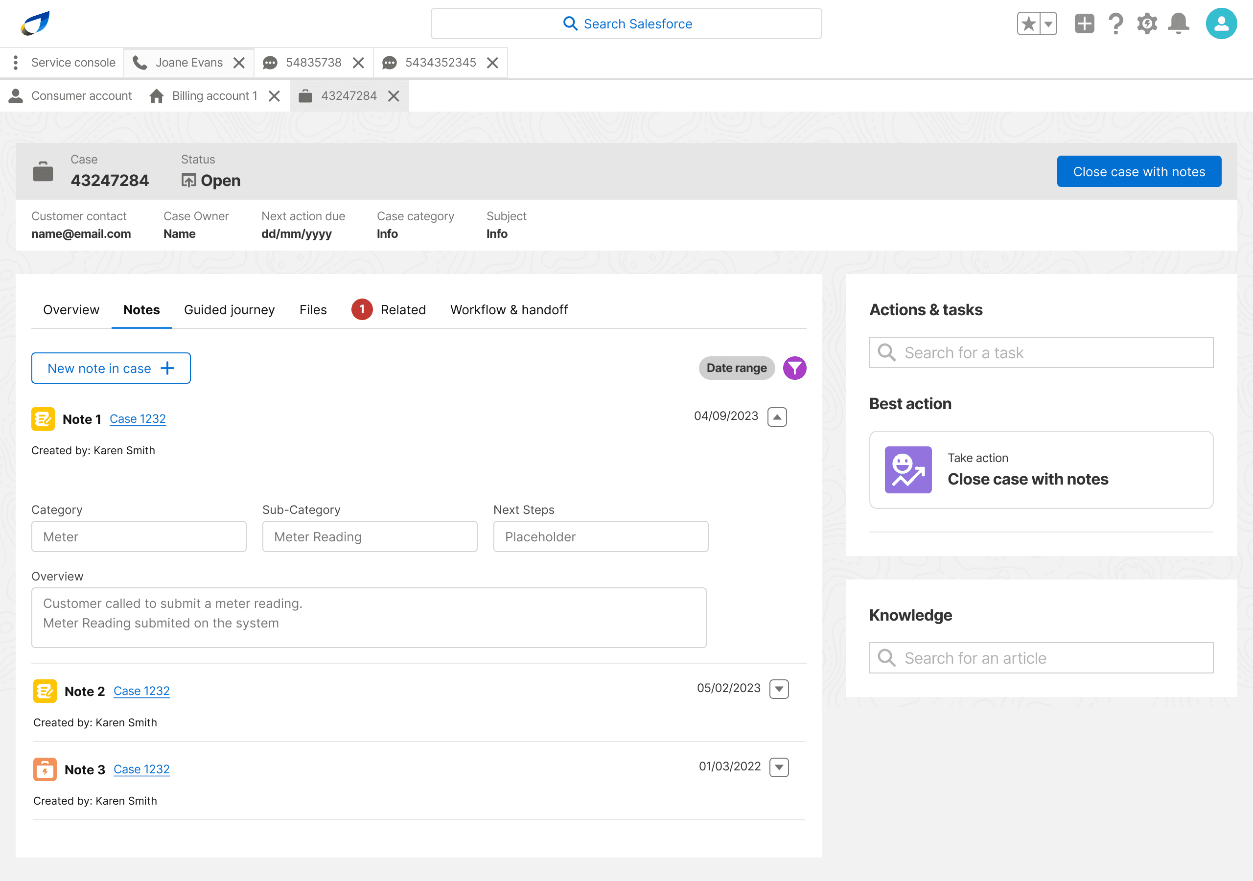 We moved most of things to do with a case away from a generic and repeating feature in the customer details page and into it's own kind of tab. Within this tab, we surfaced all the key functions agents needed to action any case.