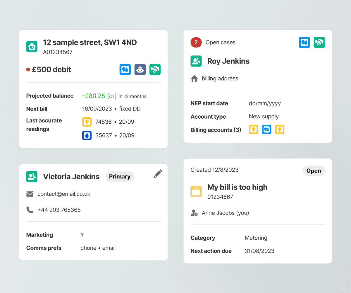 We developed and refined cards that represented each of our 4 major objects: contacts, accounts, service addresses and cases.